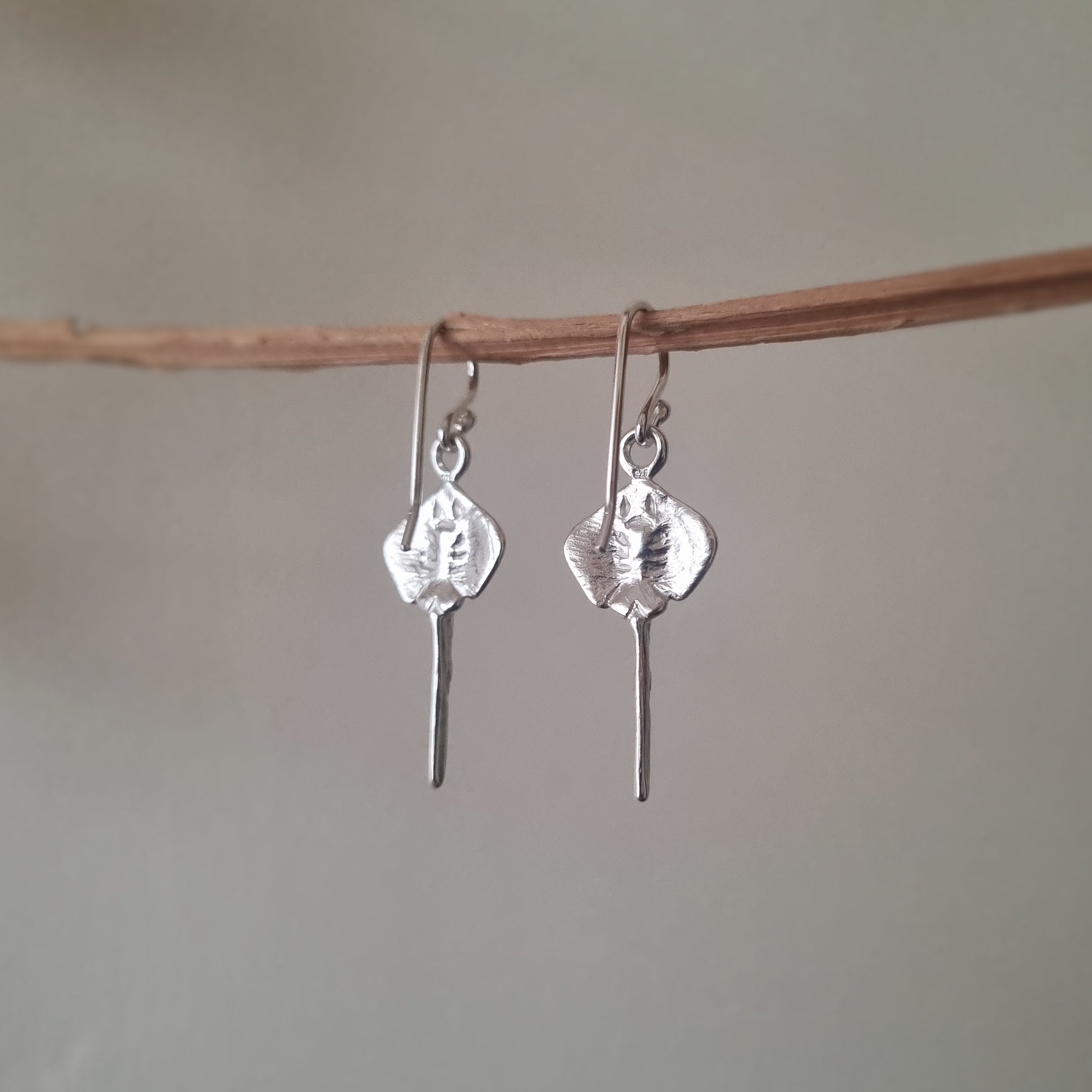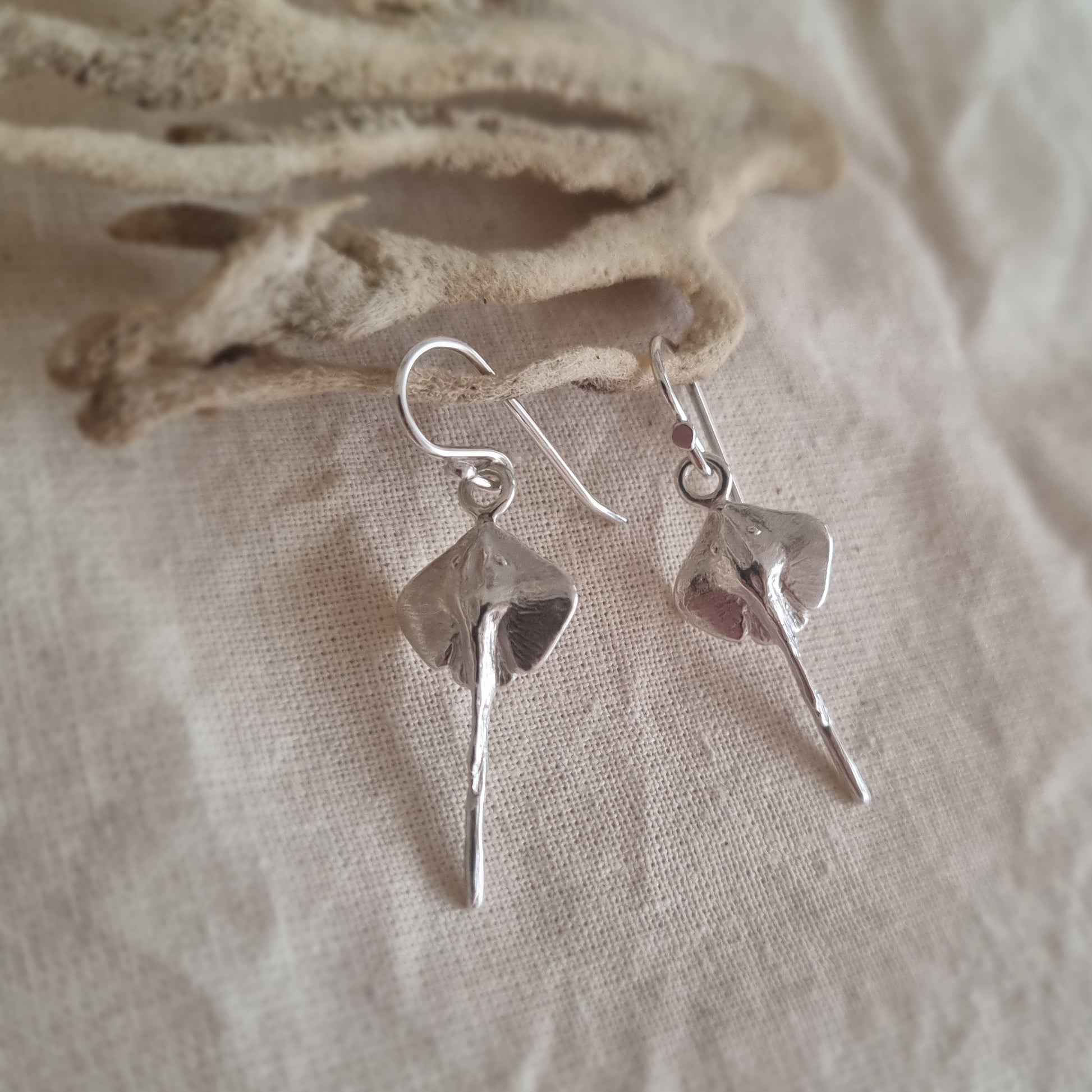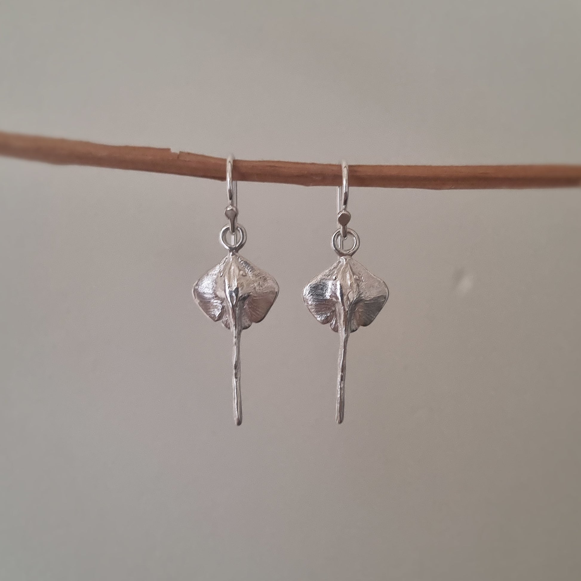Each stingray is fully sculpted in sterling silver, with detailed carving on both the top and underside, celebrating the creature’s form from every angle. Finished with handmade earring hooks in my signature style, these earrings are designed for comfort and everyday wear.
